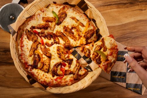 Authentically prepared paratha with an Italian twist. A traditional paratha smothered in homemade pomodoro sauce, topped with melted cheese, juicy grilled chicken steak and fresh rainbow peppers.