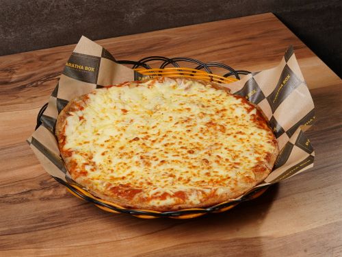 Combining two classics. A fresh paratha topped with a saucy tomato base, oozing melted mozzarella, and garnished with fresh aromatic basil.
