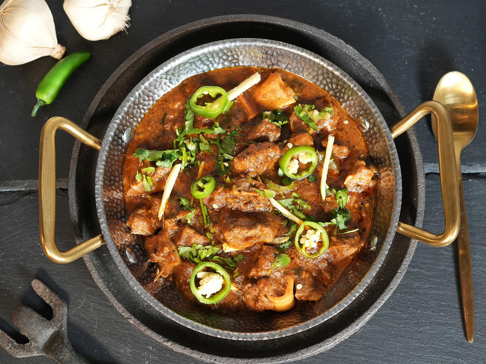 Succulent lamb is slow cooked in a medley of crushed black pepper, fiery chillies, and fragrant spices, bringing together a rich depth of taste. Discover an unforgettable, authentic experience inspired by the heart of Hyderabadi cuisine.